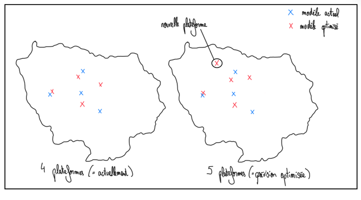 Remarque : Aujourd’hui, le foncier n’est pas forcément disponible pour créer de nouvelles plateformes suivant le modèle optimisé. L’entreprise a donc tout intérêt à conserver les plateformes là où elles se trouvent actuellement.